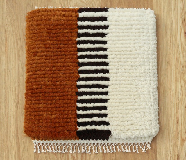サイズ:W32 × H32㎝ カラー:orange × graybeige 素材: 綿 ウール 送料:地域別に算出されます。 若松由香 倉敷本染手織り研究所卒 現在は名古屋を拠点に活動されています。 愛知県一宮市で加工されたウール糸を使用し、一枚一枚丁寧に織られた椅子敷 倉敷のノッティング織という技法で織られています。 着物用細番手の糸を束にして織り込まれているので厚みがありぎっしりと詰まった折り目が特徴です。 素材に使われているウールは温度を一定に保つ作用があるので、一年を通してお使いいただけます。 また手織りで丈夫なので、大事に使っていただくと20年程敷いていただけます。 植物や自然のものからインスピレーションを受けてデザインされた椅子敷は、華やかな中にもお部屋に馴染んでくれる自然さがあります。 座り心地もとてもよく、ふんわりと包み込まれるようです。 お手入れ 定期的に粘着テープでチリやホコリを取り除いてください。 毛並みに沿って手のひらで表面を撫でると綺麗に保てます。 お洗濯 ご自宅での手洗いが可能です。 中性洗剤を水またはぬるま湯で溶かし、押し洗い 洗濯機にて脱水したのち天日干し ウール糸が空気を含みふんわりとします。 タンブラー乾燥は避け、天日と大気に触れさせながら乾燥させてください。