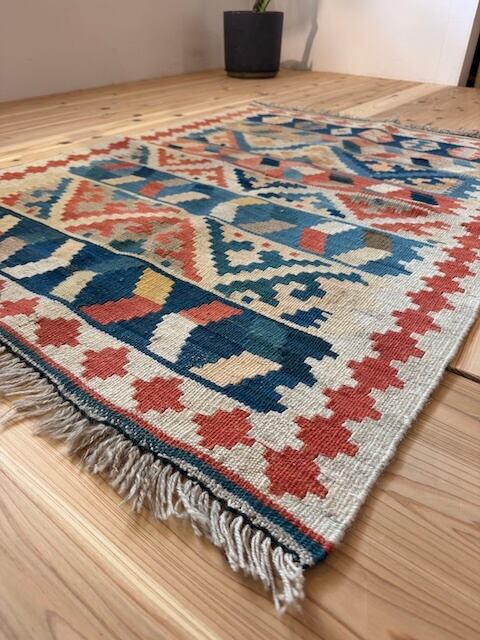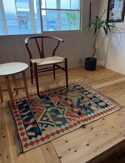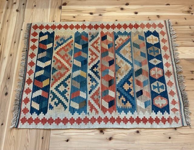 ヴィンテージラグと比べ毛足が短く厚みがないため折りたたんで持ち運ぶことも可能です。