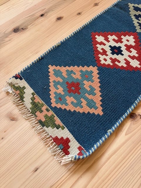 ヴィンテージラグと比べ毛足が短く厚みがないため折りたたんで持ち運ぶことも可能です。