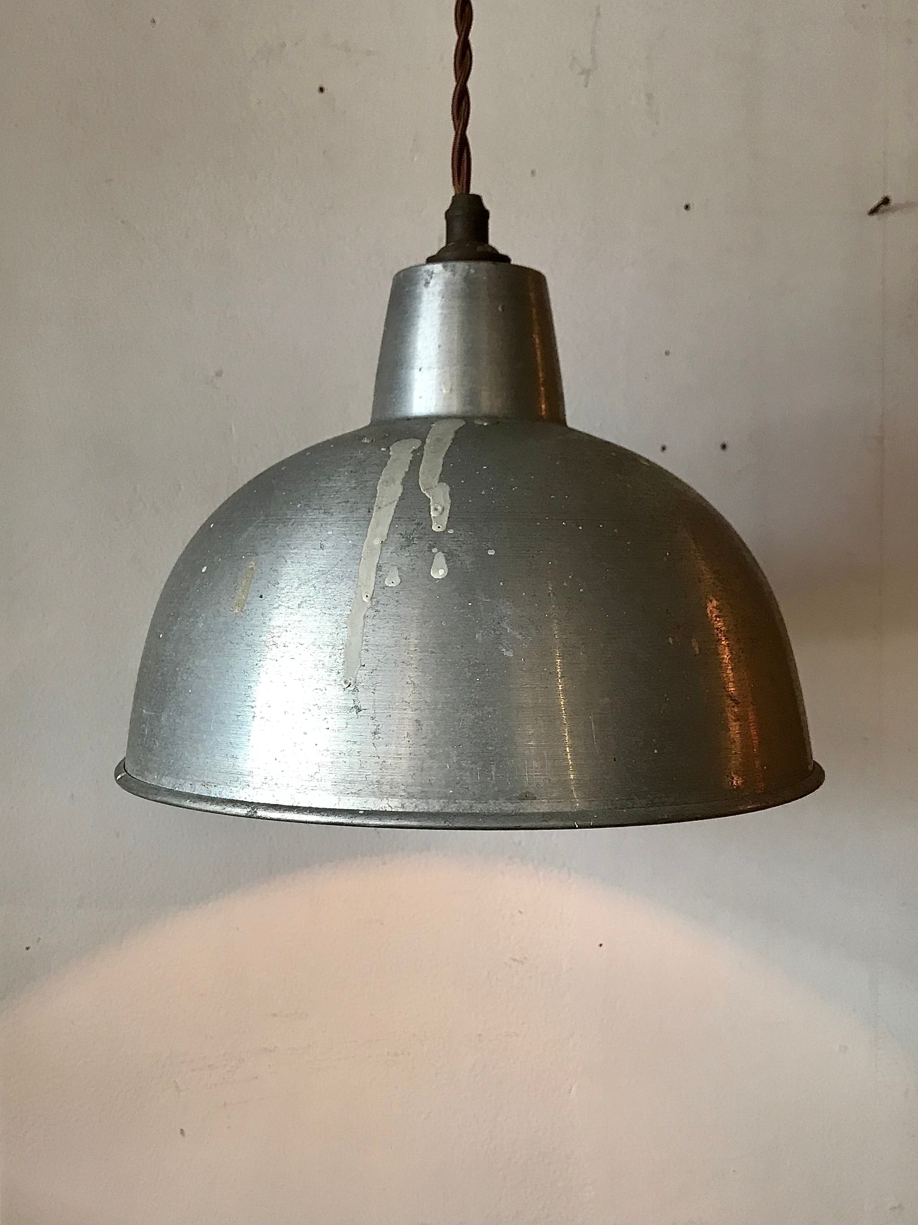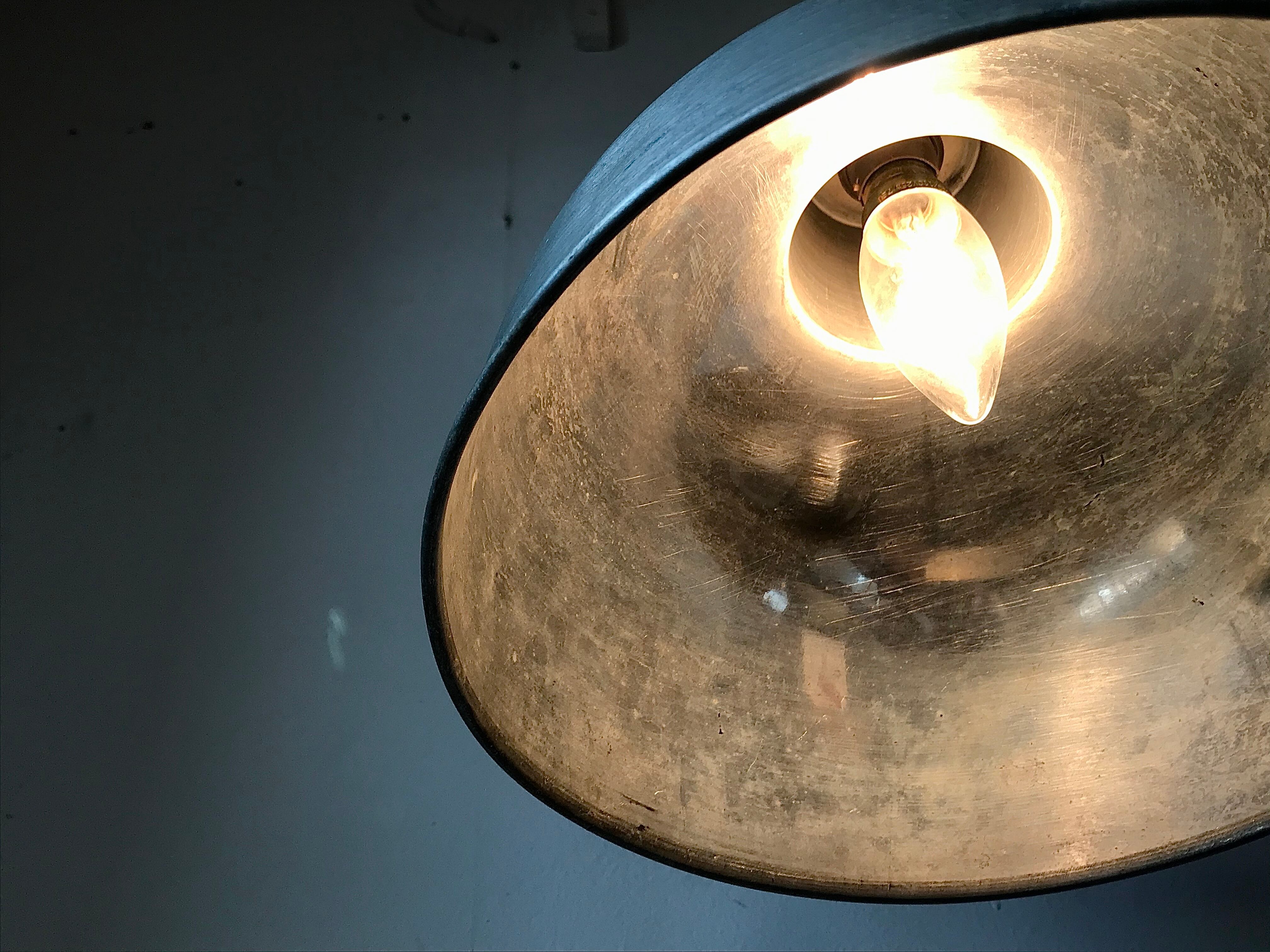 作業場で使用されていたようでペンキが飛んだところなどインダストリアルな雰囲気で素敵です。ソケットは洋球仕様となっています。電球をソケットの奥まで押しこんで回し、ピンを引っ掛けると固定されます。家電量販店では電球の取扱いが減っています。ホームセンターやオンラインショップでは入手可能ですのでご検討ください。