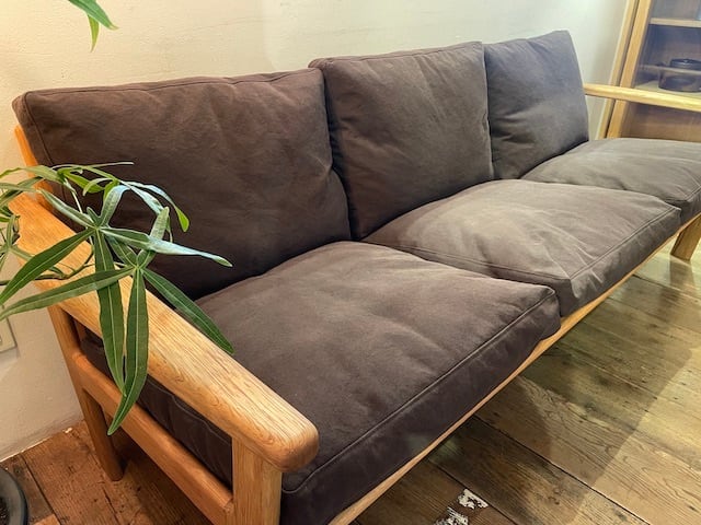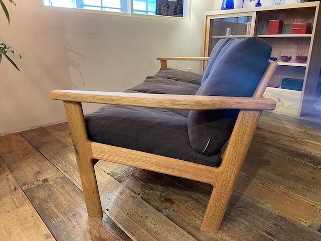使っていくうちにクッションの生地が汚れてしまった際など、クッション部分のみの新調も可能です。またクッションの中綿がヘタってきた際の中綿交換も可能です。クッションの中綿にはフェザーを使用しています。